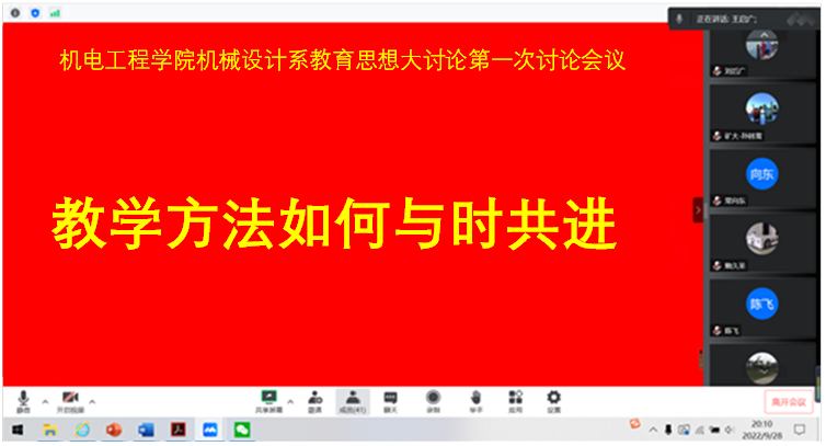 9月28日晚上8点,根据黄色直播 和黄色直播 工作部署,黄色直播 机械设计系开展了教育思想大讨论。会议采用线上形式进行,由机械设计系主任谢方伟教授主持,全系教师参加,会议邀请了教务部部长张绍良教授、督导专家韩奎教授和尹文萱教授参加讨论。