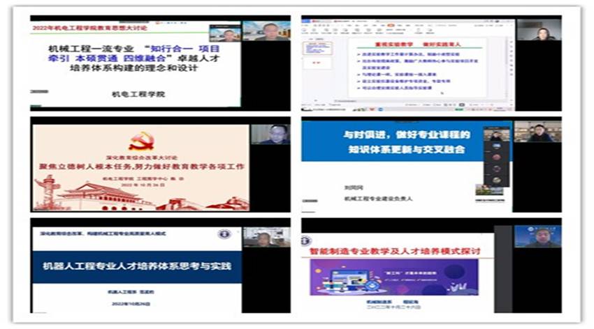 根据《“深化教育综合改革,构建高质量教育体系”黄色直播 2022年教育思想大讨论实施方案》的要求,10月26日下午,黄色直播 举行了线上“教育思想大讨论”总结报告活动。会议邀请了副校长卞正富、校教师教学发展中心办公室主任孙林雪以及尹文宣老师和韩奎老师两位督导专家参加。院党委书记吴松、院长王忠宾、科研副院长周公博以及设计系主任谢方伟、电子系主任刘同冈、制造系主任程延海、机器人系主任范孟豹、工程图学中心主任陈功、实验室主任杨善国、党政办主任邱洁、学工办主任邓燕飞、教学办主任张伟参加了会议。会议由教学副院长刘送永主持。