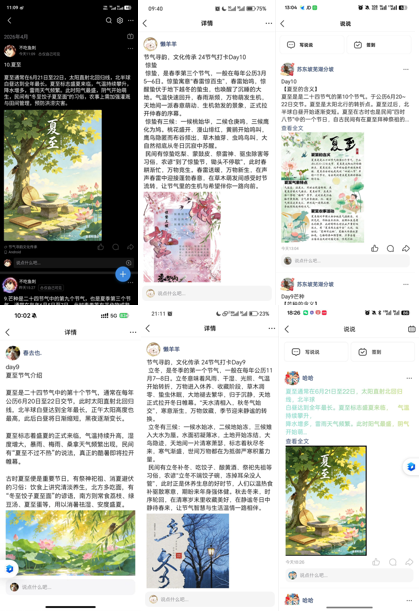 活动期间,参与同学严格按照要求,围绕每期节气主题完成创意打卡,将打卡作品发布至QQ空间并附上指定话题,阐述创作思路与节气理解,再将作品截图及发布链接提交至指定渠道完成登记。同学们积极参与、创意表达,或分享节气诗词典故,或描绘物候特征,或记录民俗习俗,在持续打卡中系统积累节气知识,感受自然节律与人文习俗的融合之美,线上参与氛围热烈浓厚。